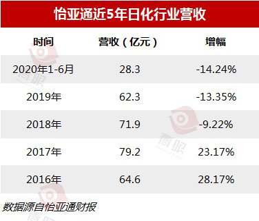 狂揽全国各地知名化妆品代理商,2016-2017年怡亚通的日化业务交上了一份亮眼成绩单。财报显示,2017年怡亚通日化业务营收达79.2亿元,同比增长23.17%。而这,也成为了怡亚通日化业绩的高光时刻,此后几年收入连年萎缩,2019年其日化收入已倒退至2016年的水平。