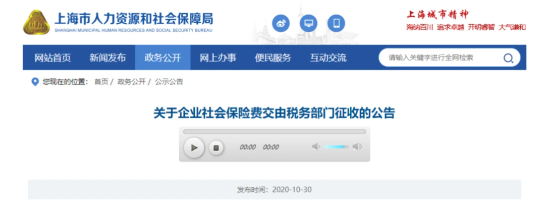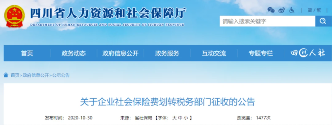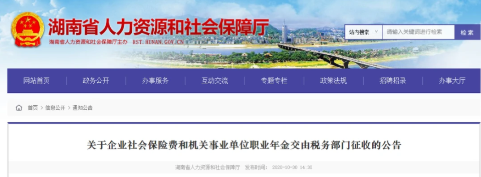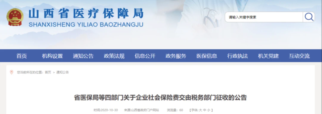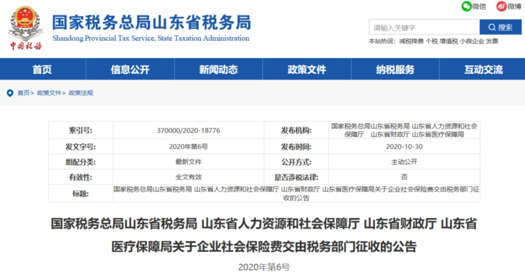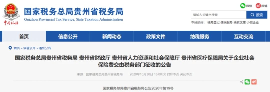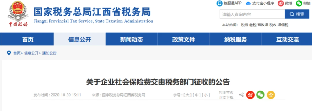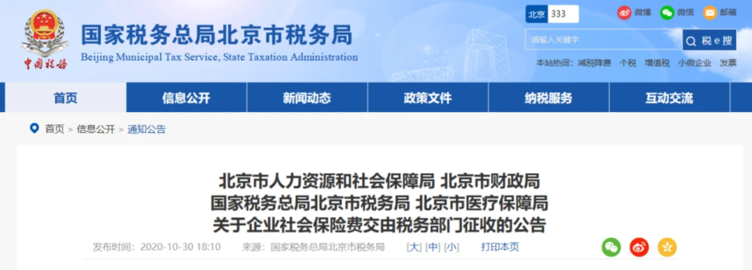 10月30日 北京、上海、山东、山西、湖南、四川、贵州、吉林、江西等地同时发布了《关于企业社会保险费交由税务部门征收的公告》的通知。